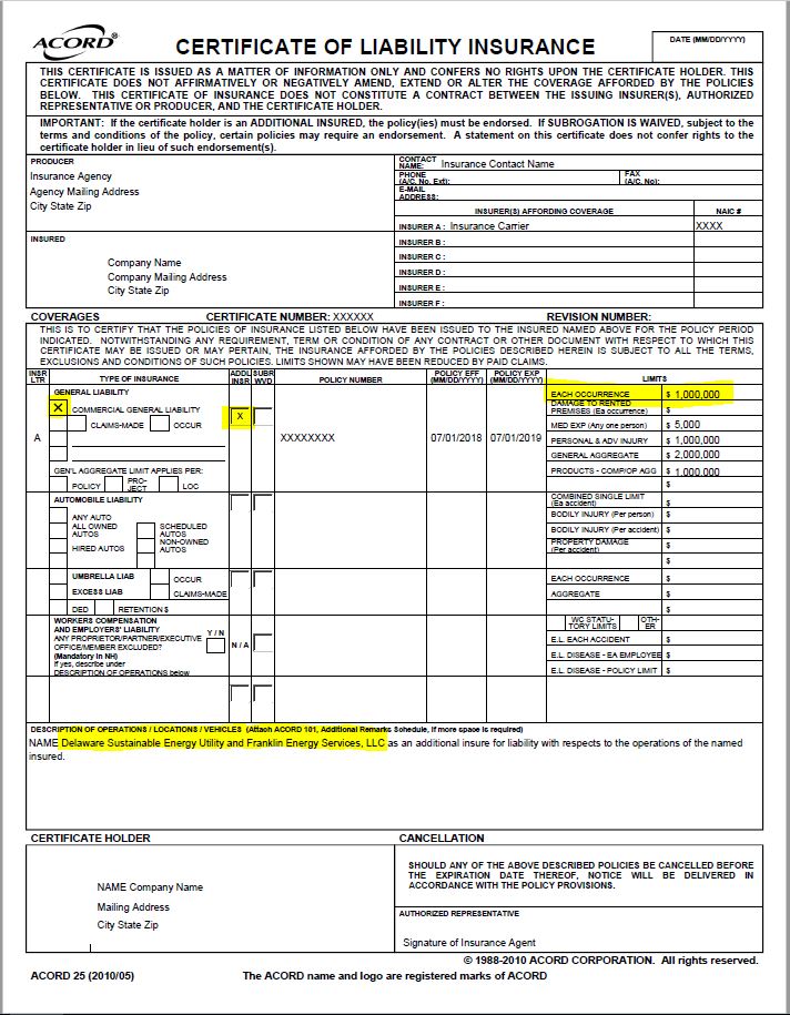 - Copy of General Liability Certificate of Insurance with minimum of $1,000,000 coverage and naming Delaware Sustainable Energy Utility and Franklin Energy Services, LLC as additionally insured (Certificate of Insurance Sample).